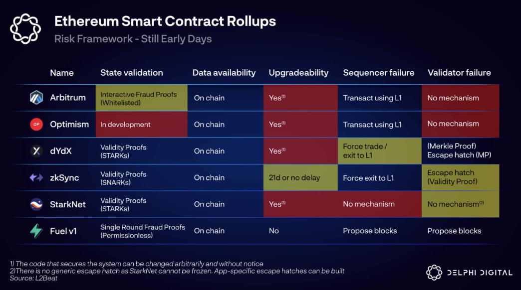 ZK rollups offer more robust security than optimistic rollups since their validity-proof-based system ensures that new states are always valid. However, ZK rollups are still susceptible to the risk of upgradability. For example, dYdX and StarkNet offer instant upgradeability, meaning that the code securing the system can be changed arbitrarily and without notice, while others implement an upgrade notice period. Consequently, a large amount of trust must be placed in the team. Greater decentralization in rollup governance is needed to guarantee trustlessness.